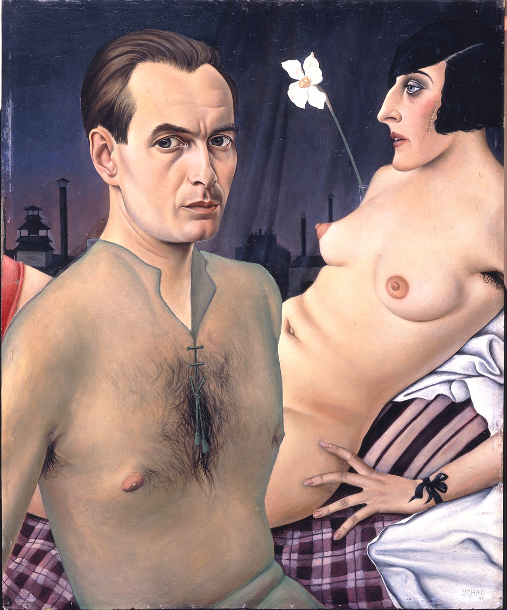 The painting "Self-Portrait with model" 1927 of Christian Shcad is striking with it's cool sensitivity and painstaking precision. Making a copy of a painting gives me a deeper understanding of it. It's not an exact replica because I wanted to make it more personal, and I changed a few things. The "model" is my boyfriend and he doesn't have "sfregio". (the facial scar of Naples women, marked by jealous husbands) The Edelweiss is replaced by a palm branch and I made the buildings in the background somewhat different, resembling the buildings in Sofia, where I live. The painting became my own, more cheerful version of Schad's.